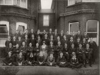 | Keywords: Herne Bay College 1925.jpg Group portrait of pupils aged perhaps 13-18yrs at Parsonage House Herne Bay College Herne Bay Kent England The lady in the photograph could be the Matron The portrait is roughly A4 size mounted on a large card At the top of the card it says Herne Bay College with the coat of arms showing the Kentish white horse symbol the Herne Bay heron symbol and an open book On the card mount below the photo it says Parsonage House autumn 1925 The photographer has written in pencil Tower Studio Herne Bay This is the photographer who took over the studio from Fred C Palmer after 1922 Scan of original photograph in my possession 1925 Tower Studios Herne Bay; individual author is anonymous out of copyright PD-old-70 Historical images of Eddington Kent Schools in Kent |
