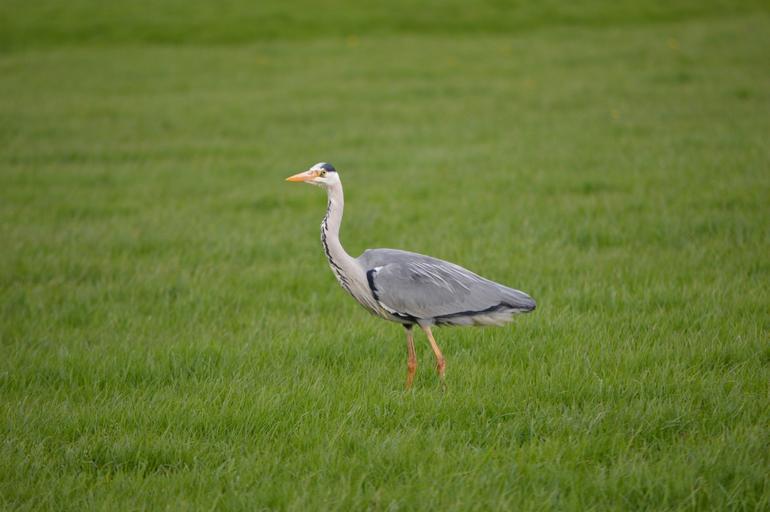 Keywords: heron birds wildlife freshwater coastal water birds grey gray plumage feathers greenery grasses green background lawns gardens grasslands meadows alone single isolated standing fauna