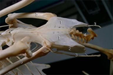 | Keywords: Heron pelvic girdle.jpg Pelvic girdle of Nycticorax nycticorax 1 ilium 2 ischium 3 pubis 4 caudal vertebrae 5 femur photograph taken by Preto m 2007-01-16 own assumed Preto Nycticorax anatomy Nycticorax nycticorax museum specimens Ardeidae bones |