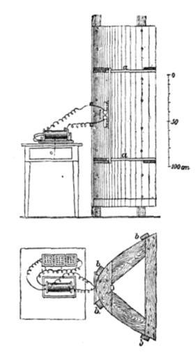 | Keywords: Hertz spark gap transmitter and parabolic antenna.png spark-gap radio transmitter and parabolic antenna used by German physicist Heinrich Hertz in 1888 during his historic first researches on radio waves Hertzian waves from his 1893 book This is the earliest example of a parabolic antenna The antenna is described on p 175 of the source as a 2 m x 2 m sheet of zinc attached to a wooden frame to make a cylindrical parabolic reflector with aperture 2 m high by 1 2 m wide with focal length of 12 5 cm Along the focal line is suspended a Hertzian dipole antenna consisting of two 1 cm dia brass rods about 13 cm long with metal balls attached to its adjacent ends to make a spark gap about 3 mm wide The dipole elements were attached to an induction coil powered by a battery on a table behind the antenna which applied high voltage pulses which caused sparks in the spark gap exciting high frequency oscillations in the dipole The wavelength of the waves produced was measured by Hertz at 66 cm making the corresponding frequency 454 MHz <br /> Hertz used a similar parabolic antenna with a spark gap for receiving With these he performed historic experiments demonstrating standing waves diffraction refraction and polarization of radio waves proving that radio waves are electromagnetic waves like light waves thus confirming the 1867 theory of James Clerk Maxwell 1893 Downloaded 2011-12-07 from http //books google com/books id d_dUAAAAMAAJ pg PA183 Heinrich Hertz Daniel Evan Jones 1893 Electric Waves 2nd Ed McGraw-Hill New York p 183 fig 35 on Google Books Creator Heinrich Hertz Public domain - Hertz died in 1894 PD-old-100 Uploaded with UploadWizard Spark-gap transmitters Parabolic antennas Heinrich Rudolf Hertz ImageNote 1 231 63 181 477 506 926 2 Parabolic reflector made of zinc sheet metal attached to wooden frame focuses radio waves from dipole into beam ImageNoteEnd 1 ImageNote 2 249 234 57 130 506 926 2 Dipole antenna made of two 13 cm brass rods with spark gap between them When high voltage from coil jumps the gap it creates a pulse of radio waves ImageNoteEnd 2 ImageNote 3 77 327 125 51 506 926 2 Induction coil Ruhmkorff coil powered by battery creates pulses of high voltage electricity ImageNoteEnd 3 ImageNote 4 105 652 107 46 506 926 2 Battery to power induction coil ImageNoteEnd 4 ImageNote 5 96 706 116 79 506 926 2 Induction coil Ruhmkorff coil generates pulses of high voltage electricity from the low voltage provided by battery ImageNoteEnd 5 ImageNote 6 244 601 167 286 506 926 2 Parabolic reflector made of zinc sheet metal attached to wooden frame focuses radio waves from dipole antenna into a beam ImageNoteEnd 6 |