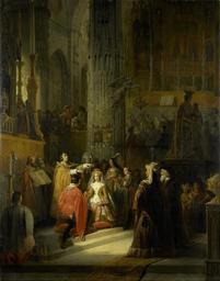 | Keywords: Het huwelijk van Jacoba van Beieren, gravin van Holland, en Jan IV, hertog van Brabant, op 10 maart 1418 Rijksmuseum SK-A-1030.jpeg nl Het huwelijk van Jacoba van Beieren gravin van Holland en Jan IV hertog van Brabant gesloten op 10 maart 1418 in de hofkapel te 's-Gravenhage Kerkinterieur waarin het paar geknield bij het altaar wordt gezegend door de priester De verzamelde aanwezigen kijken toe links stroomt het licht door het kerkvenster naar binnen Height cm 166 Width cm 132 exhibition history 2005-2006 Meesters van de Romantiek Nederlandse kunstenaars 1800-1850 Rotterdam Institution Rijksmuseum Technique oil canvas object history Acquisition 1839 object type Potential derivatives exist check http //commons wikimedia org/w/index php search Rijksmuseum+SK-A-1030 this search PD-US PD-old Data and photography rights All data and all images made available through the API are either in the public domain or are subject to a CC0 license https //www rijksmuseum nl/en/api/terms-and-conditions-of-use cc-zero place of creation http //www rijksmuseum nl/collectie/SK-A-1030 Het huwelijk van Jacoba van Beieren gravin van Holland en Jan IV hertog van Brabant op 10 maart 1418 Q17323700 Uploaded with GWToolset Het huwelijk van Jacoba van Beieren gravin van Holland en Jan IV hertog van Brabant op 10 maart 1418 Rijksmuseum SK-A-1030 http //www rijksmuseum nl/media/assets/SK-A-1030 Images uploaded by Fæ Images from the Rijksmuseum Paintings in the Rijksmuseum Amsterdam |