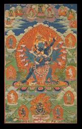 | Keywords: Hevajra-Tibetan.jpg en Tibet 18th century Mineral Pigments on Cloth 16 3/4 X 28 Inches Owned and freely licensed by Walter Arader The figures at top are centered by Vajradhara flanked by Saroruhavajra left and Virupa right At the top left is Khon Konchog Gyalpo Sachen Kunga Nyingpo and Jetsun Dragpa Gyaltsen At the top right side are Gayadhara Drogmi Lotsawa and Kedrub Geleg Pal Zangpo At the bottom center is Panjarnata Mahakala the principle protector for the Hevajra system of Tantric practice http //www walteraraderart com/himalayan-art/paintings/hevajra-thanka own Dbrunt122 1700-01-01 PD-old-70 Uploaded by owner with full permission to use freely contact walteraraderart com Virupa Tibetan Buddhist iconography Thangka from Tibet Hevajra Sachen Kunga Nyingpo |