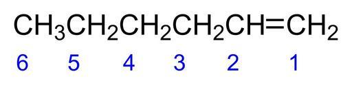 Keywords: Hex-1-ene with number.svg en Hex-1-ene with carbon numbering own Calvero 2009-11-25 Chemical structures to explain nomenclature