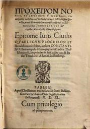 | Keywords: Εξάβιβλος του Αρμενόπουλου - Hexabiblos by Armenopoulos - 1540.png el Η αρχική σελίδα της ρώτης έντυ ης έκδοσης Παρίσι 1540 Theodor A Svallemberg του Προχείρου ή Εξάβιβλου του Κωνσταντίνου Αρμενό ουλου 1320 - 1380/1385 Η Εξάβιβλος ήταν μια Βυζαντινή νομική ραγματεία η ο οία συνέχισε να χρησιμο οιείται ευρέως στα Βαλκάνια κατά τη διάρκεια της μετέ ειτα Οθωμανικής αυτοκρατορίας Το 1828 το έργο αυτό υιοθετήθηκε ως ο νομικός κώδικας του νεοιδρυθέντος Ελληνικού κράτους ό ου και αρέμεινε σε ισχύ ως το 1946 en Front page of the first printed version Paris 1540 Theodor A Svallemberg of the Procheiron or Hexabiblos of Constantine Harmenopoulos 1320 - 1380/1385 Hexabiblos was a Byzantine legal treatise of the 14th century that continued to be widely used in the Balkan lands throughout the later Ottoman Empire's presence At 1828 it was adopted by the newly founded Greek state as the state's civic code where it remained so until 1946 1540 http //www digitale-sammlungen de/index html c autoren_index ab Constantinus+ 5BHarmenopulus 5D l en Constantinus Harmenopulus original Theodor A Svallemberg editor other versions Custom license marker 2015 02 14 PD-old-100-1923 Uploaded with UploadWizard Byzantine writers Law books Books in Greek Books in Latin |