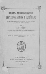 | Keywords: Hexabiblos - Constantine Harmenopoulos - 1872 - Athina - first page.jpg en Front page of the Procheiron or Hexabiblos of Constantine Harmenopoulos 1320 - 1380/1385 Athens 1872 edition by Z Noutsis modern Greek translation Hexabiblos was a Byzantine legal treatise of the 14th century that continued to be widely used in the Balkan lands throughout the later Ottoman Empire's presence At 1828 it was adopted by the newly founded Greek state as the state's civic code where it remained so until 1946 el Η αρχική σελίδα της του Προχείρου ή Εξάβιβλου του Κωνσταντίνου Αρμενό ουλου 1320 - 1380/1385 έκδοση του 1872 στην Αθήνα α ό τον Ζ ούτση μετάφραση στα νέα ελληνικά Η Εξάβιβλος ήταν μια Βυζαντινή νομική ραγματεία η ο οία συνέχισε να χρησιμο οιείται ευρέως στα Βαλκάνια κατά τη διάρκεια της μετέ ειτα Οθωμανικής αυτοκρατορίας Το 1828 το έργο αυτό υιοθετήθηκε ως ο νομικός κώδικας του νεοιδρυθέντος Ελληνικού κράτους ό ου και αρέμεινε σε ισχύ ως το 1946 1872 http //anemi lib uoc gr/search/ search_type simple display_mode overview stored_cclquery creator 28 CE 91 CF 81 CE BC CE B5 CE BD CF 8C CF 80 CE BF CF 85 CE BB CE BF CF 82 20 CE 9A CF 89 CE BD CF 83 CF 84 CE B1 CE BD CF 84 CE AF CE BD CE BF CF 82 29 rss 0 number 10 keep_number 10 offset 1 Constantine Harmenopoulos original Z Noutsis translator/editor other versions Athens Greece Custom license marker 2015 02 14 PD-old-70-1923 Byzantine writers Law books Books in Greek Uploaded with UploadWizard |