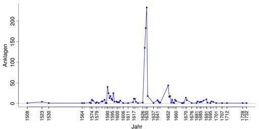 | Keywords: Hexenanklagen Herzogtum Westfalen 1508–1732.svg de Das Diagramm gibt die Zahl der Hexenanklagen im Herzogtum Westfalen zwischen 1508 und 1732 wieder Die Daten sind insofern nicht vollständig weil unbestimmte Angaben wie mehrere einige usw nicht berücksichtigt wurden Die Daten für die Grafik stammen von Rainer Decker Die Hexenverfolgungen im Herzogtum Westfalen In Alfred Bruns Red Hexen Gerichtsbarkeit im kurkölnischen Sauerland Schmallenberg 1984 S 213-218 2011-12-11 own El Grafo thumb left with log-scaled y-axis cc-zero v set working directory setwd /path/to/your/directory/ <- the path to the folder that contains data csv read the data dat <- read csv data csv The default settings for labels and tick marks are not sufficient for this data set so we have to work arond that This vector contains the years we want to be displayed below the x-axis labyears <- c 1508 1523 1530 1564 1574 1579 1590 1595 1600 1606 1611 1617 1626 1630 1637 1641 1652 1660 1670 1676 1681 1685 1691 1695 1701 1707 1712 1728 1732 open an SVG-device svg filename Hexenanklagen Herzogtum Westfalen 1508 “1732 svg width 14 height 7 pointsize 12 set the margins around the plotting area bottom left top right par mar c 6 5 1 1 set up the basic plot plot Angeklagte ~ Jahr data dat bty l type n don't plot any data yet xaxt n don't display any labels or ticks for the x-axis cex axis 1 8 magnify axis by 1 8 cex lab 1 8 magnify labels by 1 8 xlab no title for the x-axis yet ylab Anklagen title for the y-axis add basic ticks for every year in the data set axis 1 x-axis at dat Jahr position of ticks labels FALSE still no labels add selected labels for the x-axis axis 1 x-axis at labyears only the years we defined earlier las 3 vertical labels cex axis 1 5 size of the label text lwd ticks 1 8 add bigger ticks for these labels add a title for the x-axis title xlab Jahr line 5 5 lines below the axis cex lab 1 8 size of the title text add a dashed line at zero abline a 0 b 0 lty 3 plot the lines lines Angeklagte ~ Jahr data dat lwd 1 8 col blue plot the points points Angeklagte ~ Jahr data dat pch 20 col blue cex 1 5 close the device dev off Notes Um die Grafik mit R neu zu erstellen oder zu modifizieren zunächst die Daten im Abschnitt Data in einen Texteditor kopieren und als <tt>data csv</tt> abspeichern Bei Änderungen an der Grafik bitte auch den Code aktualisieren Anmerkung Dieser Code wurde unter Linux erstellt Eventuell funktioniert die SVG-Ausgabe unter Windows nicht Abhilfe sollte das R-Paket <tt>Cairo</tt> in Verbindung mit der Cairo-Grafikbibliothek z B in Inkscape enthalten schaffen To recreate or modify the plot with R copy the Data to your favourite editor and save it as <tt>data csv</tt> If you update the plot please remember to update the code too Note This code was written and tested on a Linux-machine The SVG-export might work differently unter Windows The R-package <tt>Cairo</tt> used together with the cairo graphics library included in Inkscape should do the trick Data <pre> Jahr Angeklagte Hingerichtete 1508 1 1 1523 4 4 1530 1 NA 1564 1 NA 1566 1 NA 1572 2 NA 1573 1 NA 1574 9 9 1575 7 7 1578 1 1 1579 3 3 1581 1 1 1584 5 5 1585 5 4 1587 9 NA 1588 1 NA 1589 1 1 1590 40 NA 1591 25 17 1592 13 6 1593 18 14 1594 11 8 1595 8 8 1596 25 16 1597 4 NA 1599 5 5 1600 3 NA 1601 3 NA 1602 3 NA 1603 7 5 1606 1 1 1611 1 1 1616 3 NA 1617 12 NA 1618 11 1 1619 4 1 1621 1 1 1626 2 2 1628 135 124 1629 183 164 1630 233 192 1631 18 15 1637 1 1 1641 8 NA 1642 5 4 1643 2 NA 1644 2 2 1652 44 41 1653 16 12 1654 18 15 1655 2 1 1656 9 5 1657 2 2 1658 1 1 1659 9 7 1660 6 5 1666 1 1 1667 1 1 1668 2 NA 1670 14 13 1671 8 7 1676 1 NA 1681 1 1 1682 5 2 1684 3 3 1685 4 3 1686 4 1 1688 7 NA 1691 10 10 1692 2 1 1695 1 1 1696 5 1 1698 4 NA 1701 1 1 1707 1 NA 1712 1 NA 1728 1 1 1732 1 NA </pre> Uploaded with UploadWizard Witch hunts Files by User El Grafo |