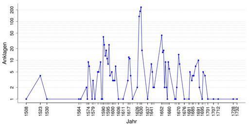 | Keywords: Hexenanklagen Herzogtum Westfalen 1508–1732 logscale.svg de Das Diagramm gibt die Zahl der Hexenanklagen im Herzogtum Westfalen zwischen 1508 und 1732 wieder Die Daten sind insofern nicht vollständig weil unbestimmte Angaben wie mehrere einige usw nicht berücksichtigt wurden Die Daten für die Grafik stammen von Rainer Decker Die Hexenverfolgungen im Herzogtum Westfalen In Alfred Bruns Red Hexen Gerichtsbarkeit im kurkölnischen Sauerland Schmallenberg 1984 S 213-218 2011-12-14 own El Grafo thumb left without logscaled y-axis cc-zero v set working directory setwd /path/to/your/directory/ <- the path to the folder that contains data csv read the data dat <- read csv data csv The default settings for labels and tick marks are not sufficient for this data set so we have to work arond that This vector contains the years we want to be displayed below the x-axis labyears <- c 1508 1523 1530 1564 1574 1579 1590 1595 1600 1606 1611 1617 1626 1630 1637 1641 1652 1660 1670 1676 1681 1685 1691 1695 1701 1707 1712 1728 1732 open an SVG-device svg filename Hexenanklagen Herzogtum Westfalen 1508 “1732 logscale svg width 14 height 7 pointsize 12 set the margins around the plotting area bottom left top right par mar c 6 5 1 1 set up the basic plot plot Angeklagte ~ Jahr data dat bty l type n don't plot any data yet xaxt n don't display any labels or ticks for the x-axis yaxt n don't display any labels or ticks for the y-axis cex lab 1 8 magnify labels by 1 8 xlab no title for the x-axis yet ylab Anklagen title for the y-axis log y logscale y-values add basic ticks for every year in the data set axis 1 x-axis at dat Jahr position of ticks labels FALSE still no labels add selected labels for the x-axis axis 1 x-axis at labyears only the years we defined earlier las 3 vertical labels cex axis 1 5 size of the label text lwd ticks 1 8 add bigger ticks for these labels add a title for the x-axis title xlab Jahr line 5 5 lines below the axis cex lab 1 8 size of the title text add ticks and labels for y-axis axis 2 y-axis at c 1 2 5 10 20 50 100 200 places to put ticks and labels cex axis 1 5 size of label text add some lines to help realize the log-scale ablines <- log10 c seq from 1 to 9 by 1 seq from 10 to 100 by 10 200 for i in seq length ablines abline a ablinesi b 0 lty 3 col grey plot the lines lines Angeklagte ~ Jahr data dat lwd 1 8 col blue plot the points points Angeklagte ~ Jahr data dat pch 20 col blue cex 1 5 close the device dev off Notes Um die Grafik mit R neu zu erstellen oder zu modifizieren zunächst die Daten im Abschnitt Data in einen Texteditor kopieren und als <tt>data csv</tt> abspeichern Bei Änderungen an der Grafik bitte auch den Code aktualisieren Anmerkung Dieser Code wurde unter Linux erstellt Eventuell funktioniert die SVG-Ausgabe unter Windows nicht Abhilfe sollte das R-Paket <tt>Cairo</tt> in Verbindung mit der Cairo-Grafikbibliothek z B in Inkscape enthalten schaffen To recreate or modify the plot with R copy the Data to your favourite editor and save it as <tt>data csv</tt> If you update the plot please remember to update the code too Note This code was written and tested on a Linux-machine The SVG-export might work differently unter Windows The R-package <tt>Cairo</tt> used together with the cairo graphics library included in Inkscape should do the trick Data <pre> Jahr Angeklagte Hingerichtete 1508 1 1 1523 4 4 1530 1 NA 1564 1 NA 1566 1 NA 1572 2 NA 1573 1 NA 1574 9 9 1575 7 7 1578 1 1 1579 3 3 1581 1 1 1584 5 5 1585 5 4 1587 9 NA 1588 1 NA 1589 1 1 1590 40 NA 1591 25 17 1592 13 6 1593 18 14 1594 11 8 1595 8 8 1596 25 16 1597 4 NA 1599 5 5 1600 3 NA 1601 3 NA 1602 3 NA 1603 7 5 1606 1 1 1611 1 1 1616 3 NA 1617 12 NA 1618 11 1 1619 4 1 1621 1 1 1626 2 2 1628 135 124 1629 183 164 1630 233 192 1631 18 15 1637 1 1 1641 8 NA 1642 5 4 1643 2 NA 1644 2 2 1652 44 41 1653 16 12 1654 18 15 1655 2 1 1656 9 5 1657 2 2 1658 1 1 1659 9 7 1660 6 5 1666 1 1 1667 1 1 1668 2 NA 1670 14 13 1671 8 7 1676 1 NA 1681 1 1 1682 5 2 1684 3 3 1685 4 3 1686 4 1 1688 7 NA 1691 10 10 1692 2 1 1695 1 1 1696 5 1 1698 4 NA 1701 1 1 1707 1 NA 1712 1 NA 1728 1 1 1732 1 NA </pre> Witch hunts Files by User El Grafo |