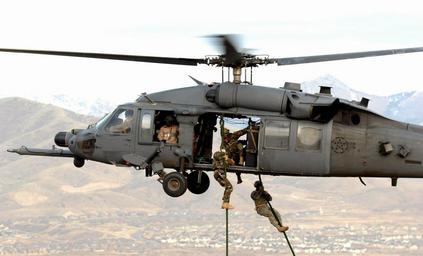 | Keywords: HH-60 Pave Hawk training.jpg en Army personnel from the Utah National Guard 19th Special Forces unit are lifted on board an Air Force HH-60 Pave Hawk helicopter over the Utah Test and Training Range on Nov 9 2007 during a Combat Search and Rescue Integration Exercise held Nov 6-15 in Utah U S Air Force photo by Master Sgt Kevin J Gruenwald 2007-11-09 17 06 50 http //www defense gov/dodcmsshare/WeekInPhotos/2007-11/hires_071109-F-6911G-304 jpg Kevin J Gruenwald PD-USAF PD-USGov Uploaded with UploadWizard Sikorsky HH-60 Pave Hawk |