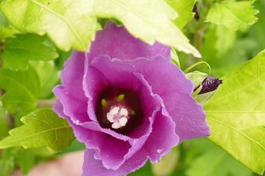 Keywords: hibiscus blossom bloom young green unfinished leaves violet macro