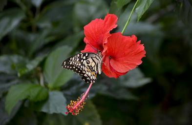 Keywords: hibiscus flower red blooming the stigma pollination the morning long wildflowers the fence leaf green butterfly butterfly wings many color beans suite quiet red flowers plant vietnam fresh