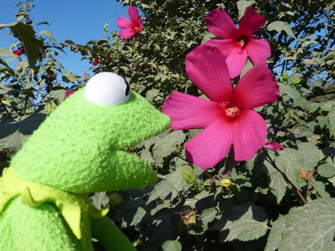 Keywords: hibiscus pink blossom bloom flower plant smell kermit frog green