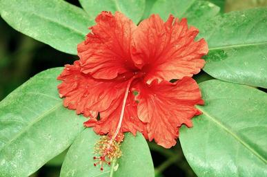 Keywords: hibiscus plant red flower flower pistil nature poppy flower leaf macro green background