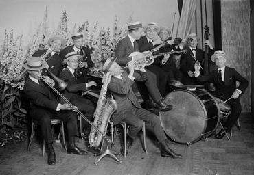| Keywords: Hickman Orch Action Shot.jpg Art Hickman His Orchestra Bain News Service photo probably taken on the Orchestra's trip to New York City in 1919 or 1920 Art Hickman at right on drums Per http //www gracyk com/hickman shtml personnel at this time was Steve Douglas violin Walt Roesner trumpet Fred Kaufmann trombone Clyde Doerr alto and baritone saxes oboe and clarinet Bert Ralton soprano and tenor saxes and clarinet Frank Ellis piano Vic King tenor banjo Ben Black plectrum banjo Bela Spiller string bass and Art Hickman drums piano and slide whistle Bain News Service photo labeled only Hickman Via Library of Congress website http //www loc gov/pictures/item/ggb2006006090/; high res TIF border cropped contrast adjusted and converted to jpg before uploading to Wikimedia Commons Not dated probably 1919 or 1920 Uncredited photographer for Bain News Service PD-Bain Art Hickman Musical groups from California Music in 1919 Straw boaters |