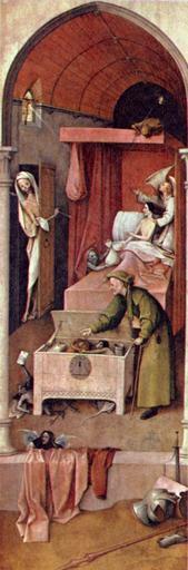 | Keywords: Hieronymus Bosch 050.jpg Jheronimus Bosch 050 jpg Artwork LangSwitch Der Tod und der Geizhals Death and the Miser La mort du pauvre Mors pauperis De dood van een vrek <ref>http //boijmans cultuurwijs nl/onderw/ckvbosch/6vrek1 htm CKV 1 project Jheronimus Bosch en navolgers</ref> Alternate titles LangSwitch Allegory of Avarice <br />Death and the Usurer De Dood van de vrek <ref>De Tolnay 1986; ISBN 9061131642 p 346 </ref> <br />Sterfbed van een vrek<ref>Tent cat Jheronimus Bosch 's-Hertogenbosch 1967 cat nr 51 </ref> oil panel cm 92 6 30 8 institution National Gallery of Art Object history by Other date ~ 1826 Private collection England <br /> by Other date ~ 1926 art dealer Highgate Village London by 1926 Raven Massy and Lester art dealers London by 1932 Asscher and Walker art dealers London by 1932 Baron Joseph Van der Elst 1896-1971 Brussels 1951 3 17 purchase Samuel H Kress Foundation New York Baron Joseph Van der Elst Brussels ProvenanceEvent 1952 gift NGA Washington D C by exchange The Yorck Project 10 000 Meisterwerke der Malerei DVD-ROM 2002 ISBN 3936122202 Distributed by DIRECTMEDIA Publishing GmbH 1952 5 33 LangSwitch c 1494 or later 1490-1500 Ca 1494 of later 1490-1500 Creator Hieronymus Bosch http //mail wikipedia org/pipermail/wikide-l/2005-April/012195 html Other versions <gallery> File Jheronimus_Bosch_050 jpg Version from deitchman com File DeathOfTheMiser BoschDrawing jpg Copy </gallery> PD-old-100 PD-Art-YorckProject LangSwitch Notes Noten <references /> Death and the Miser by Hieronymus Bosch |