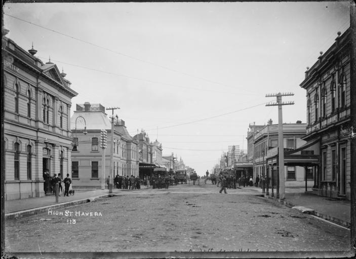| Keywords: blackandwhite monochrome road architecture outdoor building photo border black and white View of High Street in Hawera, with the Egmont Hotel centre left, and the business premises of F H Boase and C Crane partially visible in the centre. Photograph taken ca 1907-1912 by William Archer Price of Auckland. Inscriptions: Inscribed - Photographer's title on negative -bottom left: High St., Hawera. 113 . Quantity: 1 b&w original negative(s). Physical Description: Dry plate glass negative 4.5 x 6.5 inches High Street, Hawera. Price, William Archer, 1866-1948 :Collection of post card negatives. Ref: 1/2-000967-G. Alexander Turnbull Library, Wellington, New Zealand. natlib.govt.nz/records/22453071 View of High Street in Hawera, with the Egmont Hotel centre left, and the business premises of F H Boase and C Crane partially visible in the centre. Photograph taken ca 1907-1912 by William Archer Price of Auckland. Inscriptions: Inscribed - Photographer's title on negative -bottom left: High St., Hawera. 113 . Quantity: 1 b&w original negative(s). Physical Description: Dry plate glass negative 4.5 x 6.5 inches High Street, Hawera. Price, William Archer, 1866-1948 :Collection of post card negatives. Ref: 1/2-000967-G. Alexander Turnbull Library, Wellington, New Zealand. natlib.govt.nz/records/22453071 |