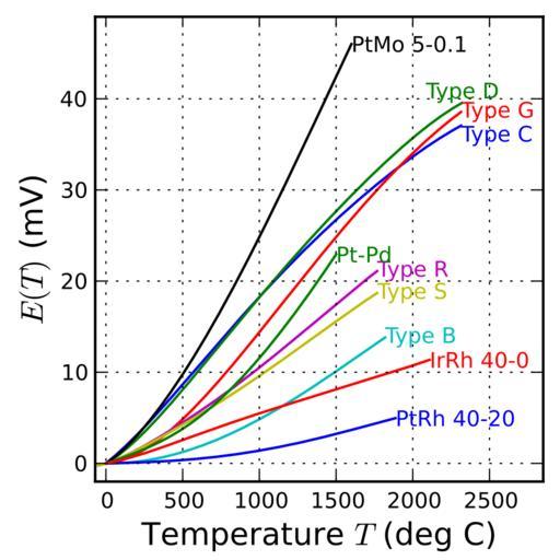 | Keywords: High temperature thermocouples reference functions.svg en Type B R S thermocouples' reference functions using NIST ITS-90 calibration curves plus type C D G thermocouples' functions from OMEGA Inc 's datasheet note these are IPTS68 calibrations Python source code can be found on File Low_temperature_thermocouples_reference_functions svg 2013-12-07 19 48 53 own Nanite cc-zero Uploaded with UploadWizard Thermocouple diagrams | ||||