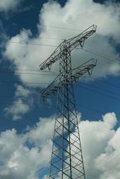 Keywords: high voltage mast air wires blue sky cables flow mast electricity powerlines high voltage pylon clouds cumulus clouds