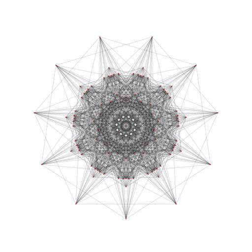 | Keywords: Higman-Sims-01.svg Created with Sage Higman “Sims graph as an orthogonal projection from a subset of the Leech lattice emphasizing a rotational symmetry of order 11 There are 11 possible such projections if we require all 22 points connected to the center point to form a regular 22-gon around it graphe de Higman “Sims comme projection orthogonale d'un sous-ensemble du réseau de Leech mettant en évidence une symétrie rotationnelle d'ordre 11 Il y a 11 telles projections possibles si on impose aux 22 points reliés au point central de former un 22-gone régulier autour de lui own Gro-Tsen 2010-10-30 Source code The following Sage source code can be used to generate the graph data for this file and the similarly named ones the actual SVG files were generated by postprocessing this output with a simple Perl script not listed here <syntaxhighlight lang python >m24 MathieuGroup 24 lst m24 conjugacy_classes_representatives elt x for x in lst if x order 11 0 fixthis Permutation elt fixed_points octad0 Permutation x fixed_points for x in lst if x order 2 and len Permutation x fixed_points 8 0 octads gap Orbit gap m24 octad0 OnSets sage octads22 o for o in octads if fixthis0 in o and fixthis1 in o pointP QQ 24 4 if i+1 in fixthis else 0 for i in range 24 pointsQ QQ 24 -3 if i k else 1 for i in range 24 for k in range 24 if not k+1 in fixthis pointsR QQ 24 2 if i+1 in o else 0 for i in range 24 for o in octads22 hsGraph pointP + pointsQ + pointsR melt elt matrix def sqnorm v return sum x x for x in v adjacency i for i in range i0 if sqnorm hsGraphi-hsGraphi0 48 for i0 in range 100 def chop v if abs v <1 e-9 return 0 return v p sum melt i N exp -2 I i pi/11 for i in range 11 /11 def writeit twist fname v p CC 24 1 if i 0 else N exp twist I pi/11 if i 1 else 0 for i in range 24 va RR 24 vi real for i in range 24 vb RR 24 vi imag for i in range 24 t va norm v / t va / t vb / t coords va pt vb pt for pt in hsGraph fd open fname w for i0 in range 100 for i in adjacencyi0 print >>fd line chop coordsi00 chop coordsi01 chop coordsi0 chop coordsi1 for pt in coords print >>fd point chop pt0 chop pt1 fd close for i in range 1 22 2 writeit i /tmp/hs 02d dat i </syntaxhighlight> Higman-Sims Graph Images with Sage source code |