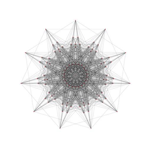Keywords: Higman-Sims-03.svg Higman-Sims graph as an orthogonal projection from a subset of the Leech lattice emphasizing a rotational symmetry of order 11 There are 11 possible such projections if we require all 22 points connected to the center point to form a regular 22-gon around it graphe de Higman-Sims comme projection orthogonale d'un sous-ensemble du réseau de Leech mettant en évidence une symétrie rotationnelle d'ordre 11 Il y a 11 telles projections possibles si on impose aux 22 points reliés au point central de former un 22-gone régulier autour de lui own Gro-Tsen 2010-10-30 Higman-Sims Graph |