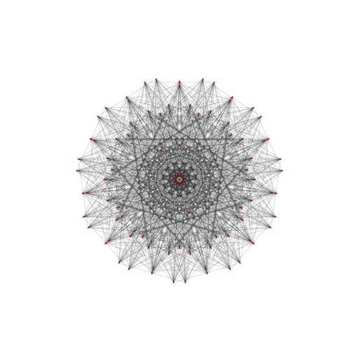 Keywords: Higman-Sims-07.svg Higman-Sims graph as an orthogonal projection from a subset of the Leech lattice emphasizing a rotational symmetry of order 11 There are 11 possible such projections if we require all 22 points connected to the center point to form a regular 22-gon around it graphe de Higman-Sims comme projection orthogonale d'un sous-ensemble du réseau de Leech mettant en évidence une symétrie rotationnelle d'ordre 11 Il y a 11 telles projections possibles si on impose aux 22 points reliés au point central de former un 22-gone régulier autour de lui own Gro-Tsen 2010-10-30 Higman-Sims Graph |