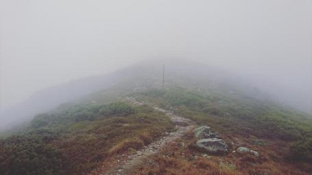 Keywords: hike mist hiking landscape fog nature scenery outdoor travel path mountain green hill grass trail peak