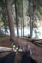 Keywords: hiking break resting legs shoes trees nature friends water river canada banff mountains