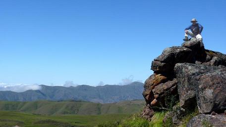 Keywords: hiking trekking blue sky man pause resting person sitting
