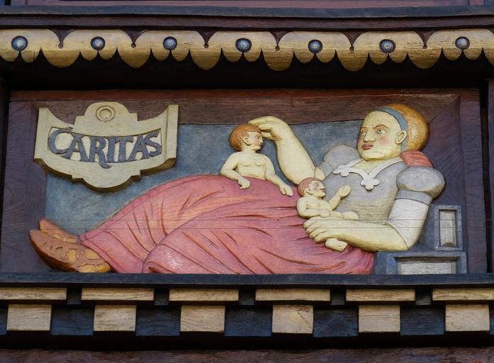 Keywords: hildesheim germany lower saxony historically old town facade truss fachwerkhaus relief image caritas help care mother children