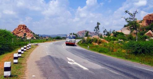 Keywords: hill road bend road rocks bus sky clouds landscape plateau deccan hillocks karnataka india