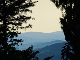 Keywords: hills view vanishing pastel blue landscape nature tree foliage looking through lokkout