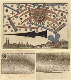 | Keywords: Himmelserscheinung über Nürnberg vom 14. April 1561.jpg Hanns Glaser Druck Hanns Glaser print Himmelserscheinung über Nürnberg vom 14 April 1561 Flugblatt aus Nürnberg Phénomènes célestes ovnis en forme de disque sphère cigare et boomerang au-dessus de Nuremberg date de publication 14 Avril 1561 Avis de Nouvelles une forme précoce de journal imprimé le 14 Avril 1561 à Nuremberg Allemagne et décrivant le phénomène céleste qui a eu lieu sur Nuremberg le 4 Avril 1561 De en Wickiana collection une collection importante de news du 16ème siècle News notice an early form of newspaper printed on 14 April 1561 in Nuremberg describing the celestial phenomenon that occurred over Nuremberg on the 4th of April 1561 From en Wickiana collection an important collection of news items from the 16th century 1561 Technique woodcut Size cm 38 26 2 image only Zentralbibliothek Zürich Graphische Sammlung object history credit line Anno M D LXI An dem XIIII tag Aprillis zu morgens zwischen Aim gehn tag und dem garauß/ das ist zu morgens zwischen 4 und 5 auff der kleinen uhr/ ist ein sehr erschröcklich gesicht an der Sonn wie sie im auffgang gewesen erschinnen/ und zu Nürmberg in der Stat und vor dem thor und auff dem Land von vielen manns und weybs personen gesehen worden Erstlich ist die Sonn mit zweyen blutfarben halbrunden strichen/ gleichförmig wann der Monn im abnemen/ mitten durch die Sonne erschinnen und gesehen worden/ und inn der Sonne/ oben/ unten/ und auff beden seytte blutfarbe/ und eines theyls blößliche oder Eysenfarbe auch schwartzfarb runde Kugel gestanden/ Desselben gleichen auff bayden seytten und ringscheyben umb die Sonne herumb/ sein solche blutrote/ und der andern kugel in anzal viel/ etwo drey inn die lenge/ unter weylen vier inn einem Quatrangel/ auch etliche ainzig gestanden/ Und zwischen solchen Creutzen und Kugeln sein blutfarbe streyme hinden dick/ Und vorn hinauß/ etwas geschmeydiger alls hocken rhor/ Allenthalben mit ein vermischt geweser/ samt unter andern zweyen grossen rorn/ eines zur rechten/ und des ander zur lincken handt stehent/ in welchen kleinen und grossen Rorn/ zu dreyen/ auch vier und mehr kugel gewesen Dieses alles hat mit einander anfahen zu streyten/ sein die kugel so erstlicht in der Sonn ge wesen/ herauß auff die/ so zu beyden seytten gestanden/ gefarn/ so sein die so heraussen gewesen sampt den kugeln auß den klein und grossen Rorn/ inn die Sonne hinein gefarn/ zu dem haben die Ror eben so sehr alle die kugel unter einander gefarn/ und hefftig alles mit einander gestritten und gefochten/ bey einer guten stunde/ Und wie der Streyt das ein weyl inn die Sonne hinein/ und widerumb herauß am hefftigsten hin und her gefaren/ sich dermassen miteinander abgematt/ Ist es alles wie obverzeychnet von der Sonnen/ vom Hymel herab auff die erden gleich alls ob es alles Brennet gefallen/ und mit einem grossen dampff herunten auff der Erden allgemach vergangen Nach solchem allen ist auch gleichförmig einem schwartzen Speer/ der schafft vom auffgang/ Und die spitzen zum Nidergang inn grosser dick und leng gesehen worden Was aber solche zeychen bedeuten/ ist Gott allein wissent/ dieweyl wir aber kurtz auffeinander/ soviel und mancherley zeychen am Hymel haben/ die uns der Allmechtige Gott/ von unsers sündlichen lebens/ damit er uns gern zur buß reitzen und locken wolt/ erscheinen lest/ so sein wir leyder so undanckbar/ das wir solche hohe zeychen und Wunderwerck Gottes verachten/ Auch spötlich davon reden/ und inn winde schlagen/ Zubesorgen es werde uns Gott umb unserer undanckbarkeyt willen/ ein schröckliche straff senden/ Jedoch werden solchs die Gotsfürchtigen in keinen weg verachten/ sünder alle diese trewe warnung ires gnedigen Vatters im Hymel behertzigen/ ir Leben bessern/ Gott trewlich bitten/ Das er seinen billigen zorn/ sampt der wol verdienten straff von uns wöll abwenden/ Damit wir alls seine kinder hie zeytlich/ und dort ewig leben mögen darzu uns Gott allen wölle helffen/ Amen Bey Hanns Glaser Brieffmaler/ ze Nürmberg accession number Zentralbibliothek Zürich http //opac nebis ch/F/ local_base NEBIS con_lng GER func find-b find_code SYS request 005289279 PD-old-100 other versions <gallery> File Nuremberg1561 jpg File Nuremberg Apr 14 1561 jpg </gallery> Astronomical events Different types of UFOs UFO 16th-century woodcuts Comets in Literature 1561 in art 1561 in Nuremberg Written documents related to UFOs Nürnberg vom 14 April 1561 Presumed UFO in art Nürnberg vom 14 April 1561 Wickiana Hans Glaser |