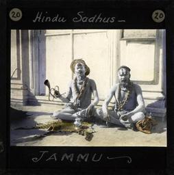 | Keywords: Hindu Sadhus, Jammu, ca.1875-ca.1940 (imp-cswc-GB-237-CSWC47-LS10-020).jpg en <br> Hindu Sadhus Jammu ca 1875-ca 1940 Photograph of two Hindu Sadhus sitting in a meditative position Sadhu is a term used for a mystic a practitioner of yoga or a wandering monk The sadhu is dedicated to achieving the fourth Hindu goal of life by means of meditation and contemplation ; This belongs to a series of Church of Scotland Foreign Missions Committee lantern slides relating to Jammu City which is also known as the City of Temples A mission station occupied by Church of Scotland missionaries was founded here in the late 19th/early 20th century Jammu is also one of the three administrative divisions within Jammu and Kashmir the northernmost state in India Photographer Unknown Filename imp-cswc-GB-237-CSWC47-LS10-020 tif Coverage date 1875/1940 Part of collection International Mission Photography Archive ca 1860-ca 1960 Geographic subject region Jammu and Kashmir Type images Part of subcollection Photographs from the Centre for the Study of World Christianity University of Edinburgh U K ca 1900-ca 1940s Repository name Centre for the Study of World Christianity Archival file impaunpub_Volume7/1736 url Repository address The University of Edinburgh School of Divinity New College Mound Place Edinburgh EH1 2LX United Kingdom Geographic subject country India Format aacr2 1 lantern slide 8 x 8 cm Geographic subject continent Asia Rights Contact the repository for details Part of series In the Temple City of Jammu LS10 Repository email divinity-CSWC ed ac uk Subject lcsh Keyword Meditation; Hinduism Date created 1875/1940 Publisher of the digital version University of Southern California Libraries Subject aat genre group portraits Format aat lantern slides Legacy record ID impa-m69244 Access conditions http //www ed ac uk/schools-departments/divinity/research/centres/world-christianity/collections-resources File GB 237 CSWC47/LS10/20 1875/1940 date created author http //digitallibrary usc edu/cdm/ref/collection/p15799coll123/id/64854 PD-old-70-1923 Magic lantern images Images from USC Digital Library uploaded by Fæ International Mission Photography Archive ca 1860-ca 1960 Sadhus People of Jammu |