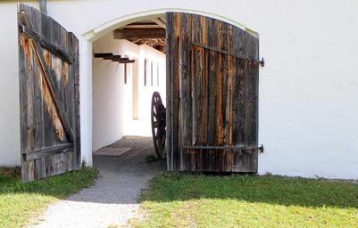 Keywords: hinged door wood goal input wood doors round arch double door historically rustic architectural style farm old yard gate agriculture