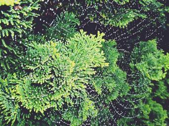 Keywords: hinoki cypress cypress tree tree green plant nature garden chamaecyparis obtusa hinoky cypress shell cypress periwinkle scaly flora close cobweb dew raindrop drip