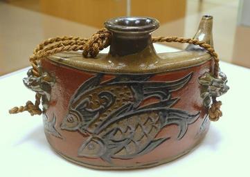 | Keywords: Hip flask with fish design, Okinawa, 2002, glazed stoneware with sgraffito, polychrome overglaze enamels, and outlines in cobalt underglaze - Ethnological Museum, Berlin - DSC02049.JPG en Exhibit in the Ethnological Museum Berlin Germany Photography was permitted in the museum without restriction 2014-11-11 10 48 50 own Daderot other versions cc-zero Ceramics of Okinawa in the Ethnological Museum Berlin Uploaded with UploadWizard | ||||