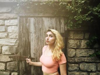 Keywords: hipster lense flair indie rugged woman young blond piercing door open wall