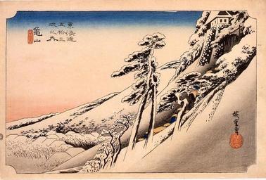 | Keywords: Hiroshige-53-Stations-Hoeido-47-Kameyama-Edo-Tokyo-M-01.jpg en Station Kameyama žClear Weather after Snow yukibare 雪晴; variant a; publisher seal HoeidÅ ä¿ æ°¸å ‚ Database of the Edo Tokyo Museum Creator Utagawa Hiroshige ~ 1833/35 PD-old-100 The Fifty-three Stations of the TÅkaidÅ HoeidÅ Edition original prints-variants |