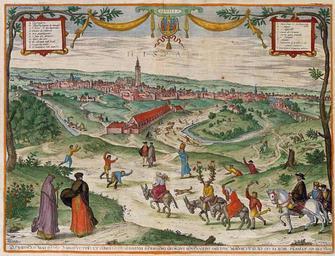 | Keywords: Hispalis (Seville), Braun & Hoefnagel, 1565.jpg en A view of the city of Seville under its Roman name Hispalis published in the third volume of Georg Braun's Civitatis Orbis Terrarum 1597 ; a somewhat exaggerated perspective taken from viewpoint somewhere near the palace of Buhaira south-east of the city looking west or slightly northwest The lower part of the painting shows a strange scene itemised in the Key as S Execution de Justicia de los cornudos patientes and T Execution de l'acazuettas publicas The patient cuckold a man with bound hands wearing horns made from leafy branches or antlers wrapped with greenery hung with bells and flags and his adulterous wife half-dressed and surrounded by a swarm of bees riding asses presumably as a punishment for their shameful behaviour Or is his wife the woman on the third ass who appears to be beating him and is in turn being beaten with a strap or belt by the man with a trumpet Onlookers are making the cabrón the obscene sign of the horns http //pamphletofarchitecture blogspot com/ Photographer unknown; artwork originally by Joris Hoefnagel engraved by Franz Hogenberg 1565 published 1597 PD-Art http //pamphletofarchitecture blogspot com/2010/09/blog-post html PD-Art Maps and topographical views by Joris Hoefnagel Ž Paintings of Seville Public humiliation People with donkeys in art Horns in art Walls in art Historical images of Walls of Seville |