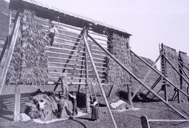 Keywords: Histe Tschamut.jpg Kornhisten in Tschamut/Tujetsch werden beladen 1913 André Schenker-Nay Die Surselva und Ilanz - Eine Zeitreise durch vier Jahrhunderte Somedi Buchverlag 2015 1913 Pater Karl Hager Tujetsch Hay drying racks PD-old