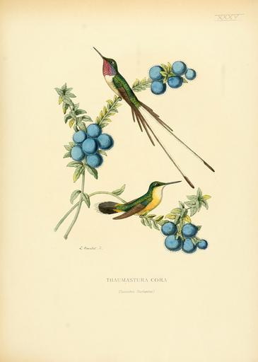 | Keywords: Histoirenaturell00muls 0077.jpg Thaumastura cora Etienne Mulsant et Edouard Verreaux Histoire naturelle des oiseaux-mouches ou Colibris constituant la famille des trochilidés Lyon Au Bureau de la Société Linnéenne http //archive org/details/histoirenaturell00muls Supplement 1861 http //en wikipedia org/wiki/Peruvian_Sheartail 1877 Louis Victor Bevalet 1808- PD-old-100 Histoire naturelle des oiseaux-mouches ou Colibris Louis Bévalet Thaumastura cora | ||||
