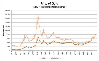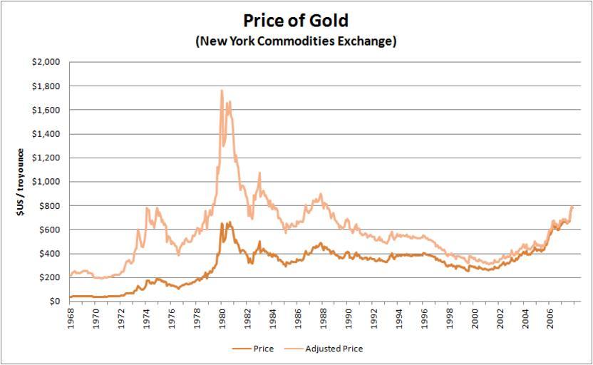 | Keywords: Historical price of gold.png Price of gold on COMEX US/oz CPI-U ftp //ftp bls gov/pub/special requests/cpi/cpiai txt and COMEX www wrenresearch com au/downloads/files/mgold csv 2008-03-29 Lalala666 Updated chart in German Fullurl toollabs svgtranslate http //upload wikimedia org/wikipedia/commons/d/d7/Historical_price_of_gold_02-2010 svg translation possible 400px Data <pre> Year Price Adjusted Price 1968 00 35 20 216 96 1968 08 35 20 216 32 1968 17 39 40 241 43 1968 25 39 10 238 89 1968 33 41 30 251 60 1968 42 41 00 248 34 1968 50 38 75 233 36 1968 58 39 90 239 60 1968 67 38 55 230 84 1968 75 39 50 235 18 1968 83 40 62 241 17 1968 92 41 72 247 00 1969 00 42 52 251 03 1969 08 42 70 250 69 1969 17 43 40 252 68 1969 25 43 60 252 44 1969 33 43 37 250 42 1969 42 40 90 234 87 1969 50 41 47 236 85 1969 58 40 92 232 44 1969 67 40 85 231 42 1969 75 40 00 225 39 1969 83 35 60 199 53 1969 92 35 17 196 07 1970 00 34 83 193 66 1970 08 34 96 193 36 1970 17 35 10 193 12 1970 25 35 95 196 26 1970 33 35 96 195 80 1970 42 35 40 191 76 1970 50 35 30 190 24 1970 58 35 25 189 97 1970 67 36 23 194 25 1970 75 38 00 202 71 1970 83 37 55 199 30 1970 92 37 40 197 50 1971 00 38 05 200 94 1971 08 38 75 204 12 1971 17 38 82 203 98 1971 25 39 20 205 46 1971 33 40 92 213 41 1971 42 40 15 207 85 1971 50 42 90 221 54 1971 58 42 85 220 74 1971 67 42 65 219 71 1971 75 42 50 218 40 1971 83 43 40 223 02 1971 92 43 55 222 71 1972 00 46 20 236 26 1972 08 48 64 247 53 1972 17 48 40 245 71 1972 25 49 30 249 68 1972 33 59 40 300 11 1972 42 64 00 322 57 1972 50 66 50 333 57 1972 58 66 85 334 53 1972 67 68 75 343 22 1972 75 64 75 321 72 1972 83 63 55 315 02 1972 92 65 00 321 45 1973 00 68 80 339 44 1973 08 82 00 401 74 1973 17 90 75 440 50 1973 25 90 70 437 23 1973 33 126 00 603 24 1973 42 122 00 580 13 1973 50 115 60 548 45 1973 58 105 10 489 79 1973 67 97 75 454 53 1973 75 98 00 451 70 1973 83 105 50 483 09 1973 92 111 75 508 38 1974 00 137 50 620 16 1974 08 175 00 779 26 1974 17 172 25 757 38 1974 25 174 70 764 96 1974 33 154 00 665 99 1974 42 149 75 642 33 1974 50 159 00 676 48 1974 58 152 50 641 04 1974 67 147 50 612 67 1974 75 168 25 692 02 1974 83 186 00 759 09 1974 92 193 00 781 58 1975 00 176 50 712 02 1975 08 185 00 740 62 1975 17 176 75 704 91 1975 25 167 05 663 71 1975 33 172 00 679 52 1975 42 162 40 636 80 1975 50 168 40 653 02 1975 58 161 85 626 47 1975 67 128 75 495 61 1975 75 142 70 546 31 1975 83 141 40 537 41 1975 92 140 75 533 02 1976 00 126 25 477 25 1976 08 132 45 498 89 1976 17 128 70 483 90 1976 25 128 70 482 17 1976 33 124 50 463 13 1976 42 123 70 457 73 1976 50 114 15 420 17 1976 58 104 38 382 20 1976 67 116 25 424 19 1976 75 124 00 450 12 1976 83 130 50 472 90 1976 92 134 63 486 19 1977 00 132 38 475 61 1977 08 143 13 509 01 1977 17 148 88 525 90 1977 25 147 38 516 26 1977 33 143 20 499 13 1977 42 143 13 495 60 1977 50 144 38 497 46 1977 58 146 13 501 85 1977 67 154 38 528 45 1977 75 161 63 551 48 1977 83 160 13 543 71 1977 92 165 13 558 88 1978 00 175 88 591 45 1978 08 182 63 610 25 1978 17 183 63 608 75 1978 25 170 63 561 23 1978 33 184 38 600 81 1978 42 183 38 591 14 1978 50 200 63 641 82 1978 58 208 13 662 79 1978 67 217 38 687 04 1978 75 241 13 755 29 1978 83 193 38 603 03 1978 92 226 38 702 80 1979 00 233 88 719 71 1979 08 251 63 765 37 1979 17 238 63 718 55 1979 25 246 38 733 48 1979 33 275 63 810 22 1979 42 279 88 813 61 1979 50 298 88 859 34 1979 58 316 38 901 03 1979 67 398 00 1 121 32 1979 75 382 50 1 069 05 1979 83 415 75 1 151 27 1979 92 526 50 1 442 74 1980 00 653 00 1 764 08 1980 08 637 00 1 696 87 1980 17 494 50 1 297 53 1980 25 518 00 1 344 09 1980 33 535 50 1 375 91 1980 42 653 50 1 660 83 1980 50 614 25 1 561 08 1980 58 631 25 1 592 73 1980 67 666 75 1 668 28 1980 75 629 00 1 558 98 1980 83 619 75 1 523 48 1980 92 589 50 1 435 68 1981 00 506 50 1 223 62 1981 08 489 00 1 169 24 1981 17 513 75 1 220 10 1981 25 482 75 1 138 75 1981 33 479 25 1 121 69 1981 42 426 00 988 25 1981 50 406 00 931 57 1981 58 425 00 967 77 1981 67 428 75 966 88 1981 75 427 00 960 87 1981 83 414 50 929 76 1981 92 400 00 894 37 1982 00 387 00 862 55 1982 08 362 60 805 60 1982 17 320 00 711 71 1982 25 361 25 800 07 1982 33 325 25 713 57 1982 42 317 50 687 95 1982 50 342 90 739 18 1982 58 411 50 885 24 1982 67 397 00 852 30 1982 75 423 25 905 88 1982 83 436 00 935 07 1982 92 448 00 964 75 1983 00 499 50 1 073 45 1983 08 408 50 876 99 1983 17 414 75 890 41 1983 25 429 25 914 99 1983 33 437 50 926 94 1983 42 416 00 878 73 1983 50 422 00 887 83 1983 58 414 25 868 92 1983 67 405 00 845 30 1983 75 382 00 794 93 1983 83 405 00 841 12 1983 92 381 50 791 54 1984 00 373 75 770 89 1984 08 394 25 809 20 1984 17 388 50 795 85 1984 25 375 80 766 10 1984 33 384 25 781 05 1984 42 373 05 756 09 1984 50 342 35 691 20 1984 58 348 25 700 42 1984 67 343 75 688 08 1984 75 333 50 665 66 1984 83 329 00 656 68 1984 92 308 30 615 36 1985 00 306 65 610 91 1985 08 287 75 570 55 1985 17 329 25 650 38 1985 25 321 35 631 81 1985 33 314 00 615 06 1985 42 317 75 620 67 1985 50 327 50 638 52 1985 58 333 25 648 53 1985 67 325 75 632 18 1985 75 325 10 628 60 1985 83 325 30 627 25 1985 92 326 80 628 42 1986 00 350 50 672 14 1986 08 338 15 650 24 1986 17 344 00 664 53 1986 25 345 75 669 14 1986 33 343 20 662 38 1986 42 346 75 665 56 1986 50 357 50 686 19 1986 58 384 70 737 06 1986 67 423 20 807 14 1986 75 401 00 764 11 1986 83 389 50 741 52 1986 92 388 75 739 42 1987 00 400 50 756 98 1987 08 405 85 764 34 1987 17 421 00 789 34 1987 25 453 25 845 28 1987 33 451 00 838 11 1987 42 447 30 828 30 1987 50 462 50 854 19 1987 58 453 40 832 99 1987 67 459 50 839 79 1987 75 468 80 854 56 1987 83 492 50 896 99 1987 92 484 10 881 69 1988 00 458 00 831 99 1988 08 426 15 772 13 1988 17 456 95 824 38 1988 25 449 00 805 89 1988 33 455 50 814 77 1988 42 436 55 777 57 1988 50 436 80 774 73 1988 58 427 75 755 49 1988 67 396 70 695 97 1988 75 412 40 721 11 1988 83 422 60 738 33 1988 92 410 25 715 56 1989 00 394 00 683 81 1989 08 387 00 668 90 1989 17 383 20 658