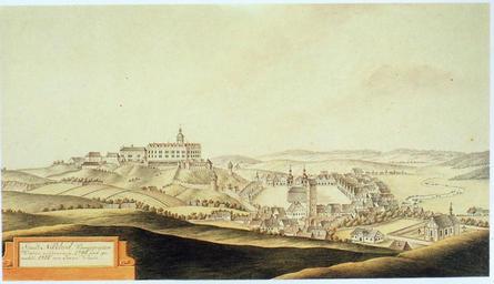 | Keywords: History of Náchod 03 - View of Náchod from Klínek.jpg en View of Náchod from Klínek Pohled na Náchod z Klínku Johann Venuto akvarel z roku 1814 podle kresby z roku 1786 Pohled na město se zámkem od západu na kterém je zachyceno spojení poddanského města se zámkem Na náměstí kostel sv Vavřince Znázornění obou městských bran Vpravo mimo ohrazené město kostel sv Michaela a nad ním Velký mlýn Občanskou zástavbu v ohrazeném městě převyšuje nově postavená synagoga která vytvořila novou dominantu města Oldřich Šafář Náchod v obraze čtyř století brožura 1814 Johann Venuto PD-old-100 History of Náchod 1814 paintings Watercolor paintings of landscapes History of Náchod Castle Paintings of castles in the Czech Republic |