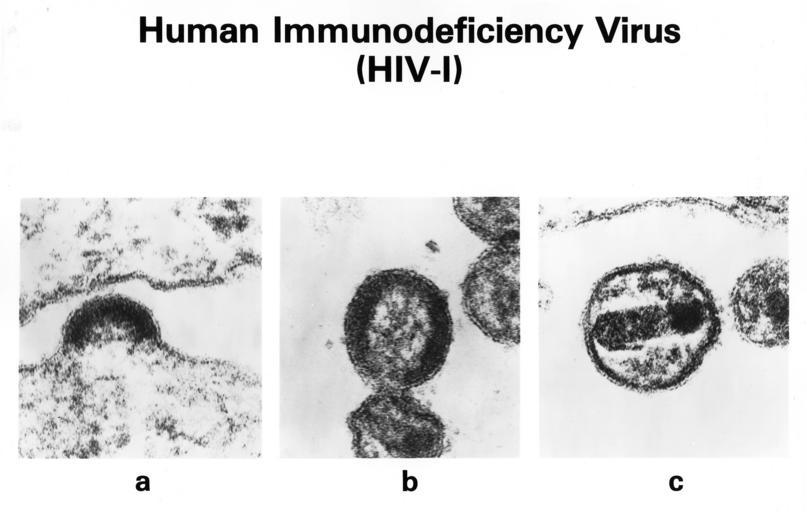Keywords: Hiv-i.jpg Three of the earliest visible stage of Human immunodeficiency virus HIV replication It occurs when viral proteins accumulate under the cell membrane in a process called budding a In the next stage a crescent shaped early bud has constricted forming a membrane-encapsulated sphere with the dense center called a viral nucleoid b As the constricting process continues the virus pinches off and becomes free extracellular infectious virus c At this stage the dark circular mucleoid condenses into a bar; this morphologic feature is used to discriminate HIV-I from HTLV-II and HTLV-III Topics/Categories Cancer Types -- AIDS-Related Cells or Tissue -- Abnormal Cells or Tissue Type B W Photo Source Laboratory of Cell And Molecular Structure National Cancer Institute Dr Matthew Gonda Photographer 2382 1988-11 Reuse Restrictions None - This image is in the public domain and can be freely reused Please credit the source and/or author listed above Dr Matthew Gonda Photographer PD-USGov-HHS-NIH Media from National Cancer Institute Visuals Online Images uploaded by Fæ HIV |