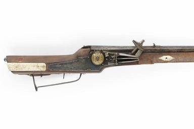 | Keywords: Hjullåsbössa, räfflad, 1600-talets början - Skoklosters slott - 90857.tif LSH artwork sv Rund över kammaren åttkantig slätborrad pipa av blånerat stål På kammaren stämplat PTS Stöckel nr 4364 dock endast PS Sachsen ca 1605 Ståndsikte av stål korn av mässing <br/>Hjullås Blånerat låsbleck av tysk typ - bakåt avsmalnande genom två fall Hjulkapseln täckt av gjuten förgylld mässingsskiva med två änglagestalter Låg vertikal krutskärm Hane med lös underkäke utan fingergrepp <br/>Hel stock av ljust trä Tysk kolvtyp Bakplåt av stödkula av stål Kolvlådelock av ben på vilket en graverad hund jagande hjort Stocken i övrigt med horn och benbrickor till låsskruvar och pipstift främre pipstiftet i form av skruv med bygel Näsband och rörka av ben Trågformig s k holsteinsk varbygel Avtryckare med ställskruv <br/>Tillbehör Laddstock med doppsko av ben Krats <br/>Märkt 131 ovanför låsblecket stanstyp 5373 28 med blyerts på anslaget ML graverat på bakplåten Rött lacksigill ovanför kolvlådan nött original caption Hjullåsbössa räfflad 1600-talets början<br/> Nyckelord Föremålsbild Dekorerade Hjullåsbössa early other date century 17 brass - wood - steel - bone size mm 1282 pipa size mm 1570 size mm 110 SKO M L place of origin Saxony original filename sm_dig7536 33747 inventory number SKO 12713 90857 CC-BY-SA Erik Lernestål Decoration Wheellock muskets Photographs of weapons by Erik Lernestål Media contributed by LSH dim-with multiple size templates Media contributed by LSH 2016-05 |
