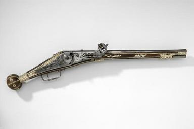 | Keywords: Hjullåspistol - Livrustkammaren - 39665.jpg Nürnberg 1500-talets slut pipa av Hans Danner lås signerat L S <br/><br/>Rund slätborrad pipa av stål med åttsidig kammare och trumf vid pipbasen samt i båda ändar av den runda delen bladformig dekor avslutad med en spets I dekoren på kammaren stämplar på mittfasen Nürnbergs stadsstämpel vapensköld och N Stöckelnr 1580-1585 och orm Stöckelnr 5858 LRK vägl 1921 188 på sidofaserna H och D Stöckelnr 2807 Rektangulärt böjt svansskruvblad <br/>Riktmedel Rektangulär siktklack med siktskåra <br/>Fästning Två häften Pipan fäst med krysskruv underifrån samt två pipstift av trä <br/><br/>Hjullås av stål plant låsbleck baktill avslutat med en spets Utvändigt hjul täckt med en välvd hjulkapsel fyrsidig hjulaxel avslutad med en liten knopp Runt kapseln en skrafferad bård Nedanför säkringsfjädern en sköldformig stämpel L S och två korslagda svärd LRK vägl 1921 274 Neue Stöckel nr 8340 Kantig fängpanna med halvcirkelformig gavel ingen krutskärm Fängpannelock med rörlig arm på locket graverat ett ansikte kantigt grepp med linjedekor genombruten spets i form av ett treflikigt blad Tryckknapp med välvt huvud med skåra saknas Hane med balusterformig kropp och stor platt hals genombruten av ett litet runt hål Lös överkäke med liten skärm och litet uppåtböjt fingergrepp överkäke och hals-underkäke graverad som två groteska ansikten det nedre på halsens skärm med en kula i munnen Käkskruv med fyrsidigt huvud avslutat med knopp Hanfjäder med punsad streckdekor två små fasningar fjäderlöv i form av ett tvåflikigt platt blad med ett litet runt hål på mitten På låsbleckets insida hjulstudel i form av en rund graverad platta stång med rankdekor <br/>Säkring Bakom hjulet en virvelsäkring med ringformigt grepp på fjädern framtill ett nedåtböjd platt blad på bygelns ändar tulpanliknande platta löv med mittskåra och ett runt hål <br/>Fästning Två låsskruvar <br/>Rak avtryckare <br/><br/>Helstock av trä bakåt avsmalnande svagt böjd kolv med liten kolvkula d 57 5 mm Beslag och inläggningar av ben med graverade och svärtade detaljer På hela stocken bredare och smalare längsgående benlister med repstavsdekor längs kolvryggen en bred list liksom på kolvens undersida den senare med ett mittband med bladdekor På kolvkulan en rund centrumplatta med repstavskant en i band upphöjd sköld med en stor ring skölden flankerad av E K Nürnberg-familjen Koler På kolvkulan i övrigt åtta radiella band av ben med repstavsdekor däremellan runda plattor med blomdekor Runt kolvänden därframför en benring l 33 mm med bladdekor Runt svansskruvbladet benplattor i form av kvinnliga hermer På stockens v sida en hare jagad av en hund Främre låsskruvbrickan i form av ett träd den bakre större och i form av ett sjöodjur vid bakre pisptiftet benplattor i form av delfiner vid främre pipstiftet plattor med bladdekor Överrörka med graverad maskaron spetsrörkan med graverad stående naken kvinna Näsband med bladdekor Varbygel i form av rund stålstav med balusterformig dekor i mitten bakre stolpen inskruvad i kolven den främre fäst med skruv <br/><br/>Tillbehör <br/>Laddstock av trä l 417 mm framtill en invändigt gängad stålskoning l 49 mm original caption hjullåspistol - LRK 4553<br/> Nyckelord Pistol Hjullåspistol Föremålsbild ca other date - 1550 1600 steel e127 - eldvapen - pipa lås och stockbeslag material stål - wood e3 - eldvapen - stock material trä - bone e78 - eldvapen - stockbeslag och stockdekor material ben size mm 628 size mm 432 pipa size mm 157 g 1045 LRK orm krönt Stöckelnr 5867 anv e1 - eldvapen - pipa; Leonhard Danner L S o korsade svärd NS 8340 anv e2 - eldvapen - lås; anonym låssmed place of origin Nürnberg original filename lm_dig2152 41094 inventory number LRK 4553 39665 CC-BY-SA Göran Schmidt <gallery caption Different images of same object > File Hjullåspistoler - Livrustkammaren - 77339 tif </gallery> Göran Schmidt Wheellock pistol images from Livrustkammaren Media contributed by LSH dim-with multiple size templates Media contributed by LSH unmatched creator Color images from Livrustkammaren Media contributed by LSH 2013-10 |
