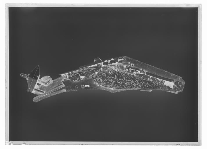 | Keywords: Hjullåspistol, puffert, Nordtyskland (Braunschweig?) ca 1560-1570 - Livrustkammaren - 26246-negative.tif Rund pipa med svag trumf och åttsidig kammare kort försänkt i vinkel böjt svansskruvblad dolt av kolvplåten Pipans ovansida helt täckt av etsad och delvis förgylld dekor ett förgyllt tvärband i båda ändar på pipan och däremellan rankdekor mot prickbakgrund På den kantiga delen en förgylld man helbild profil h barett med plym midjekort mantel pluderhosor värja På den runda delen en kvinna helbild profil v lång veckad kjol med tvärbårder överdel med långa hängande ärmar kort plagg över axlarna v hand vid midjan h hand lyft framför ansiktet hållande spegel runt föremål med hundliknande drag skaft Båda figurerna står i fält som framtill avslutas med trepassformig båge med krön i form av fransk lilja Pipans undersida endast grovfilad <br/>Fästning Två häften Pipan fäst med krysskruv samt två pipstift av stål <br/><br/>Hjullås med plant låsbleck med delvis fasade kanter Låsblecket täckt av etsad dekor med bladrankor mot prickbakgrund kantbård av omväxlande tre runda och ett avlångt blankt fält Utvändigt hjul täckt av en rombisk platta och därpå stödram i form av två från nederkanten utstickande från varandra vända etsade drakhuvuden förenade dels nertill dels genom båge med prickdekor ovanför hjulaxeln Drakarna och den rombiska plattan fästade med en skruv genom vardera drakhuvudet Kantig fängpanna på ytterkanten och bakkanten en plan skiva med svängd kant som tillsammans med fängpannas lock bildar en halvcirkel fängpannelocket saknas På skivans ovansida hakan av en grotesk mask jfr nr 17584 På låsbleckets kant därframför en etsad bladranka <br/>Hane med rak kantig kropp på framsidan en utskjutande platta med rundad kant framför käkskruven lös överkäke med antydan till fingergrepp käkskruv med litet fyrsidigt huvud På hanens utsida grövre rankdekor samt antydan till drakhuvud på käkarna Hanfjäder med framtill rundad utsida filade bladrankor dubbelt kraftigt fjäderlöv med dekor som på hanen ena bladet nedanför hjulet det andra uppåtriktat <br/>Låset invändigt svärtat Stor konturerad täckplatta från avtryckare till hjulaxel odjurshuvud framtill <br/>Säkring På låsbleckets bakre del en virvelsäkring L-formig bygel med lång profilerad främre arm avslutad med stort fjäderlöv bakom bygeln ett löv som täcker hela låsbleckets plana del och tvär avslutas vid tungan som skjuts in under kolvplåten Säkring med rinformigt platt grepp profilerad fjäder med dubbelt fjäderlöv som hanfjäderns Fästning Två låsskruvar den bakre samtidigt fästskruv för bältehaken <br/>Avtryckare Rak avtryckare fäst med skruv i kolvplåten <br/><br/>Helstock av stål med i vinkel böjd kolv avslutad med kolvkula kolvkulan delad i två halvor förenade med gångjärn på undersidan fjädrande spärr som nås genom hål i kolvkulan Kolvhalsen rundad framtill en ring med pärlstavsdekor Låsdelen av kolven samt framstocken kantiga sluten laddstocksränna framstocken därframför rundad <br/>Heltäckande etsad dekor i fält åtskilda av blanka linjer fältens botten prickad därpå rankmönster På kolvkulans yttre del bladrankor amt ovanför mittknappen en tom renässanssköld sköldhållare två lejon På kolvkulans fasta del dekor i form av stora flikiga framåtriktade blad På kolvhalsens runda del fem rektangulära fält på ovansidan två med en naken man i det ena och en naken kvinna i det andra halvt vända mot varandra draperingar över skötena På sidorna ytterligare en naken kvinna vänd mot mannen samt på den andra sidan en man i antik rustning och med kroksabel På undersidan en man likaså i antik rustning men med sköld stödd mot marken dessa två är vända mot varandra På kolvryggen därframför fram till pipan ett stort fält med en man i helfigur profil v antik rustning med lejonmaskaron på axeln pluderhosor på huvudet kaskett med plym v hand vid midjan h hand lyft hållande yxa Hela anslagssidan av stocken täcks av ett sotrt fält med bladrankor samt mellan låsskruvarna en ryttare vänd framåt hög hatt med plym dräkt med pluderhosor bakom ryttaren en hund framför honom en hare en hund och en hare På kolvens undersida ett fät runt avtryckaren samt ett fält därframför med bladrankor samt två fåglar d en främre en sittande papegoja På laddstocksrännan längsgående dekor i form av en bladranka hund och hare Som överrörka och näsband ett tvärband med förgylld rankdekor I övrigt har samtliga större figurmotiv rester av förgyllning <br/><br/>Tillbehör <br/>Laddstock av stål l 318 mm original caption ca other date - 1560 1570 steel e1279 - eldvapen - pipa lås stockbeslag och laddstock material stål g 2220 size mm 340 pipa size mm 544 LRK Erik XIV av Sverige Gustav II Adolf av Sverige Tre Konungar på Åbo slott 1993 place of origin original filename LN_B02753_005633 54178 inventory number LRK 17583 26246 CC0 Hjullåspistol puffert Nordtyskland Braunschweig ca 1560-1570 - Livrustkammaren - 26246 tif <gallery caption Different images of same object > File Hjullåspistol puffert Nordtyskland Braunschweig ca 1560-1570 - Livrustkammaren - 43271 tif File Hjullåspistol puffert Nordtyskland Braunschweig ca 1560-1570 - Livrustkammaren - 51981 tif </gallery> |