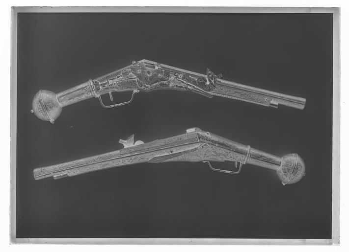 | Keywords: Hjullåspistol, puffert, Nordtyskland (Braunschweig?) ca 1560-1570 - Livrustkammaren - 43271-negative.tif Rund pipa med svag trumf och åttsidig kammare kort försänkt i vinkel böjt svansskruvblad dolt av kolvplåten Pipans ovansida helt täckt av etsad och delvis förgylld dekor ett förgyllt tvärband i båda ändar på pipan och däremellan rankdekor mot prickbakgrund På den kantiga delen en förgylld man helbild profil h barett med plym midjekort mantel pluderhosor värja På den runda delen en kvinna helbild profil v lång veckad kjol med tvärbårder överdel med långa hängande ärmar kort plagg över axlarna v hand vid midjan h hand lyft framför ansiktet hållande spegel runt föremål med hundliknande drag skaft Båda figurerna står i fält som framtill avslutas med trepassformig båge med krön i form av fransk lilja Pipans undersida endast grovfilad <br/>Fästning Två häften Pipan fäst med krysskruv samt två pipstift av stål <br/><br/>Hjullås med plant låsbleck med delvis fasade kanter Låsblecket täckt av etsad dekor med bladrankor mot prickbakgrund kantbård av omväxlande tre runda och ett avlångt blankt fält Utvändigt hjul täckt av en rombisk platta och därpå stödram i form av två från nederkanten utstickande från varandra vända etsade drakhuvuden förenade dels nertill dels genom båge med prickdekor ovanför hjulaxeln Drakarna och den rombiska plattan fästade med en skruv genom vardera drakhuvudet Kantig fängpanna på ytterkanten och bakkanten en plan skiva med svängd kant som tillsammans med fängpannas lock bildar en halvcirkel fängpannelocket saknas På skivans ovansida hakan av en grotesk mask jfr nr 17584 På låsbleckets kant därframför en etsad bladranka <br/>Hane med rak kantig kropp på framsidan en utskjutande platta med rundad kant framför käkskruven lös överkäke med antydan till fingergrepp käkskruv med litet fyrsidigt huvud På hanens utsida grövre rankdekor samt antydan till drakhuvud på käkarna Hanfjäder med framtill rundad utsida filade bladrankor dubbelt kraftigt fjäderlöv med dekor som på hanen ena bladet nedanför hjulet det andra uppåtriktat <br/>Låset invändigt svärtat Stor konturerad täckplatta från avtryckare till hjulaxel odjurshuvud framtill <br/>Säkring På låsbleckets bakre del en virvelsäkring L-formig bygel med lång profilerad främre arm avslutad med stort fjäderlöv bakom bygeln ett löv som täcker hela låsbleckets plana del och tvär avslutas vid tungan som skjuts in under kolvplåten Säkring med rinformigt platt grepp profilerad fjäder med dubbelt fjäderlöv som hanfjäderns Fästning Två låsskruvar den bakre samtidigt fästskruv för bältehaken <br/>Avtryckare Rak avtryckare fäst med skruv i kolvplåten <br/><br/>Helstock av stål med i vinkel böjd kolv avslutad med kolvkula kolvkulan delad i två halvor förenade med gångjärn på undersidan fjädrande spärr som nås genom hål i kolvkulan Kolvhalsen rundad framtill en ring med pärlstavsdekor Låsdelen av kolven samt framstocken kantiga sluten laddstocksränna framstocken därframför rundad <br/>Heltäckande etsad dekor i fält åtskilda av blanka linjer fältens botten prickad därpå rankmönster På kolvkulans yttre del bladrankor amt ovanför mittknappen en tom renässanssköld sköldhållare två lejon På kolvkulans fasta del dekor i form av stora flikiga framåtriktade blad På kolvhalsens runda del fem rektangulära fält på ovansidan två med en naken man i det ena och en naken kvinna i det andra halvt vända mot varandra draperingar över skötena På sidorna ytterligare en naken kvinna vänd mot mannen samt på den andra sidan en man i antik rustning och med kroksabel På undersidan en man likaså i antik rustning men med sköld stödd mot marken dessa två är vända mot varandra På kolvryggen därframför fram till pipan ett stort fält med en man i helfigur profil v antik rustning med lejonmaskaron på axeln pluderhosor på huvudet kaskett med plym v hand vid midjan h hand lyft hållande yxa Hela anslagssidan av stocken täcks av ett sotrt fält med bladrankor samt mellan låsskruvarna en ryttare vänd framåt hög hatt med plym dräkt med pluderhosor bakom ryttaren en hund framför honom en hare en hund och en hare På kolvens undersida ett fät runt avtryckaren samt ett fält därframför med bladrankor samt två fåglar d en främre en sittande papegoja På laddstocksrännan längsgående dekor i form av en bladranka hund och hare Som överrörka och näsband ett tvärband med förgylld rankdekor I övrigt har samtliga större figurmotiv rester av förgyllning <br/><br/>Tillbehör <br/>Laddstock av stål l 318 mm original caption ca other date - 1560 1570 steel e1279 - eldvapen - pipa lås stockbeslag och laddstock material stål g 2220 size mm 340 pipa size mm 544 LRK Erik XIV av Sverige Gustav II Adolf av Sverige Tre Konungar på Åbo slott 1993 place of origin original filename LN_B01805_004685 54178 inventory number LRK 17583 43271 CC0 Hjullåspistol puffert Nordtyskland Braunschweig ca 1560-1570 - Livrustkammaren - 43271 tif <gallery caption Different images of same object > File Hjullåspistol puffert Nordtyskland Braunschweig ca 1560-1570 - Livrustkammaren - 26246 tif File Hjullåspistol puffert Nordtyskland Braunschweig ca 1560-1570 - Livrustkammaren - 51981 tif </gallery> Hjullåspistol, puffert, Nordtyskland (Braunschweig?) ca 1560-1570 - Livrustkammaren - 43271-negative.tif Rund pipa med svag trumf och åttsidig kammare kort försänkt i vinkel böjt svansskruvblad dolt av kolvplåten Pipans ovansida helt täckt av etsad och delvis förgylld dekor ett förgyllt tvärband i båda ändar på pipan och däremellan rankdekor mot prickbakgrund På den kantiga delen en förgylld man helbild profil h barett med plym midjekort mantel pluderhosor värja På den runda delen en kvinna helbild profil v lång veckad kjol med tvärbårder överdel med långa hängande ärmar kort plagg över
