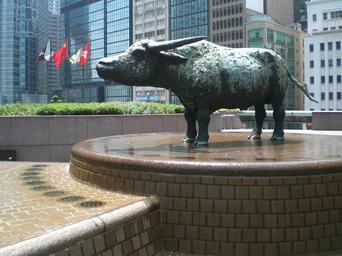 Keywords: HK Central Exchange Square Man n OX red.JPG 香港交易廣場的水牛塑像 Water buffalo Exchange Square Hong Kong Hong Kong Own See below TongQUEENS Water Buffalo I - Standing sculpture