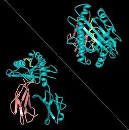 | Keywords: HLA-Cw4.png en Rendering of PDB 1IM9 the HLA-Cw4 molecule with bound Peptide KILLER CELL IMMUNOGLOBULIN-LIKE RECEPTOR 2DL1 Not shown for clarity reasons Beta-2 microglobulin rose HLA-A alpha 0401 cyan and peptide yellow This image is from Crystal structure of the human natural killer cell inhibitory receptor KIR2DL1 bound to its MHC ligand HLA-Cw4 as part of the published work Fan Q R Long E O Wiley D C 2001 Crystal structure of the human natural killer cell inhibitory receptor KIR2DL1-HLA-Cw4 complex Nat Immunol 2 452-460 The structure was rendered with PDB Protein workshop 1 5 and arranged with MS Paint own Pdeitiker 2008-09-21 HLA-C MHC Class I Cell surface antigens |