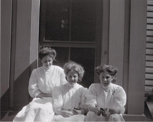 | Keywords: women 1900s clothes indoor blackandwhite black and white "Marjorie R., Marjorie Wilson, E. Creelman" Photograph of three women sitting outside a building. Marjorie Rathbun (1891-1966) was the younger sister of the photographer, Harold McMurrich Rathbun. E. Creelman might be Edith Creelman (born 14 February, 1892), daughter of Adam Creelman, a Toronto lawyer. The photograph was taken in August 1908. "Marjorie R., Marjorie Wilson, E. Creelman" Photograph of three women sitting outside a building. Marjorie Rathbun (1891-1966) was the younger sister of the photographer, Harold McMurrich Rathbun. E. Creelman might be Edith Creelman (born 14 February, 1892), daughter of Adam Creelman, a Toronto lawyer. The photograph was taken in August 1908. |